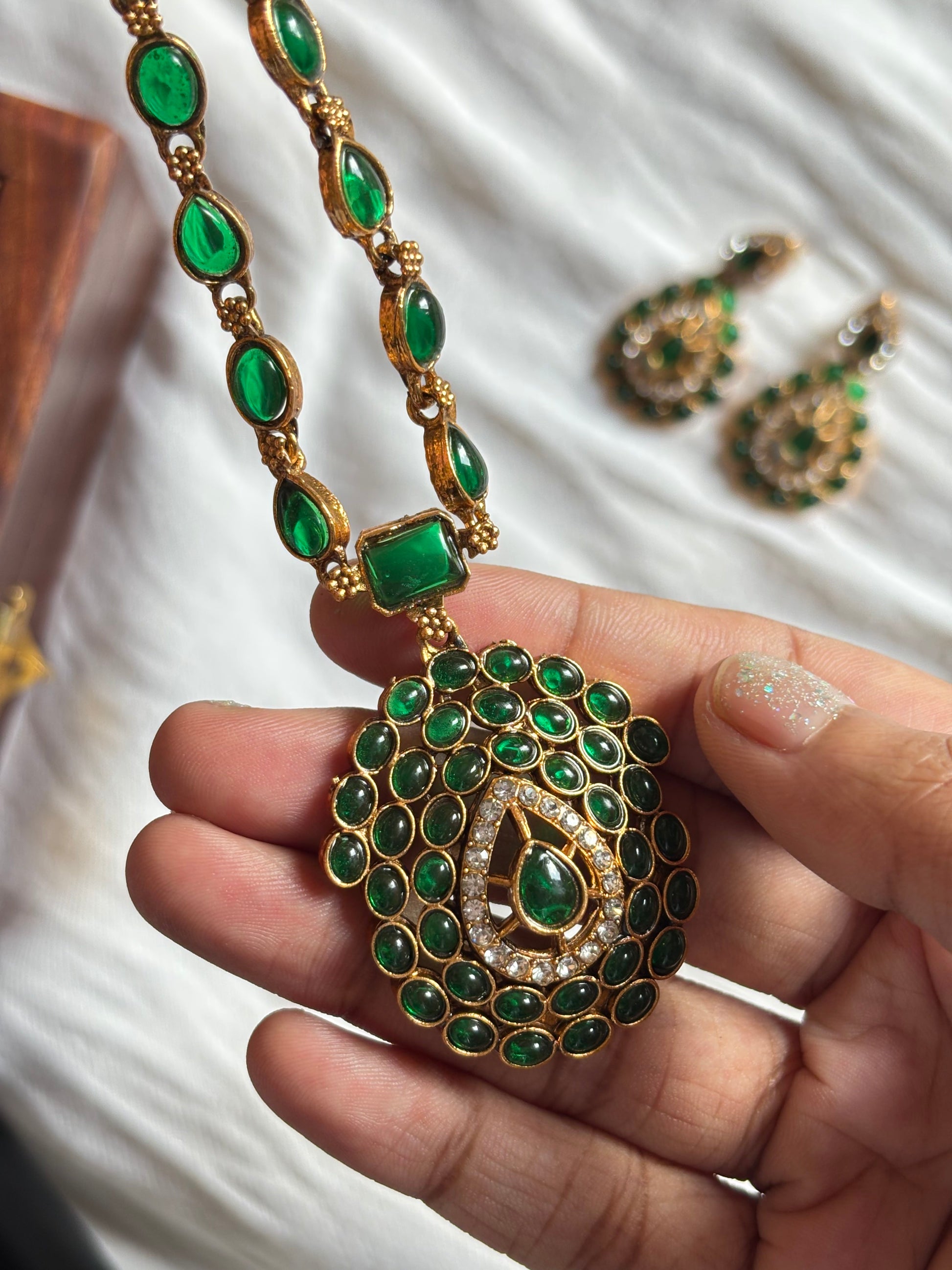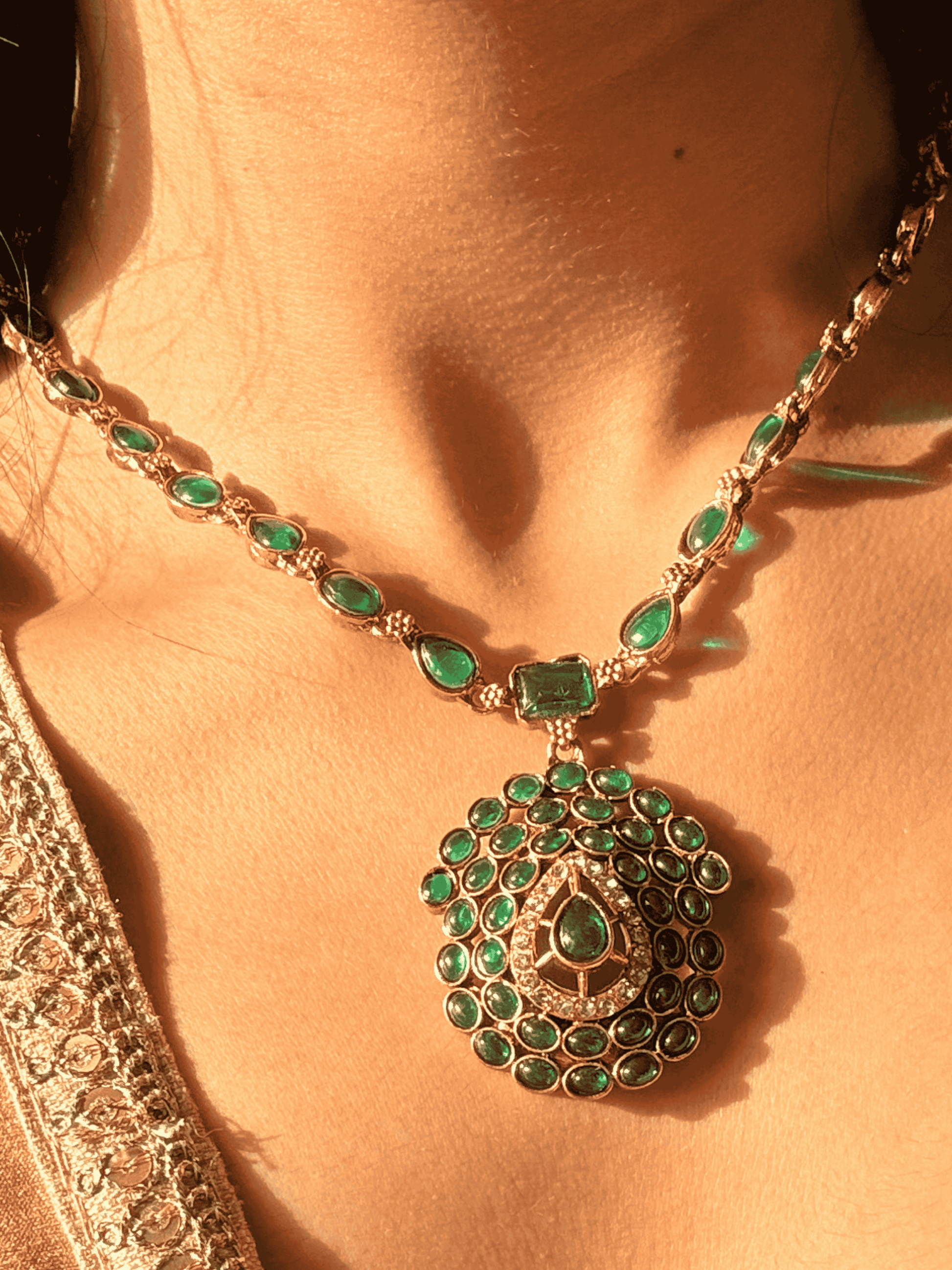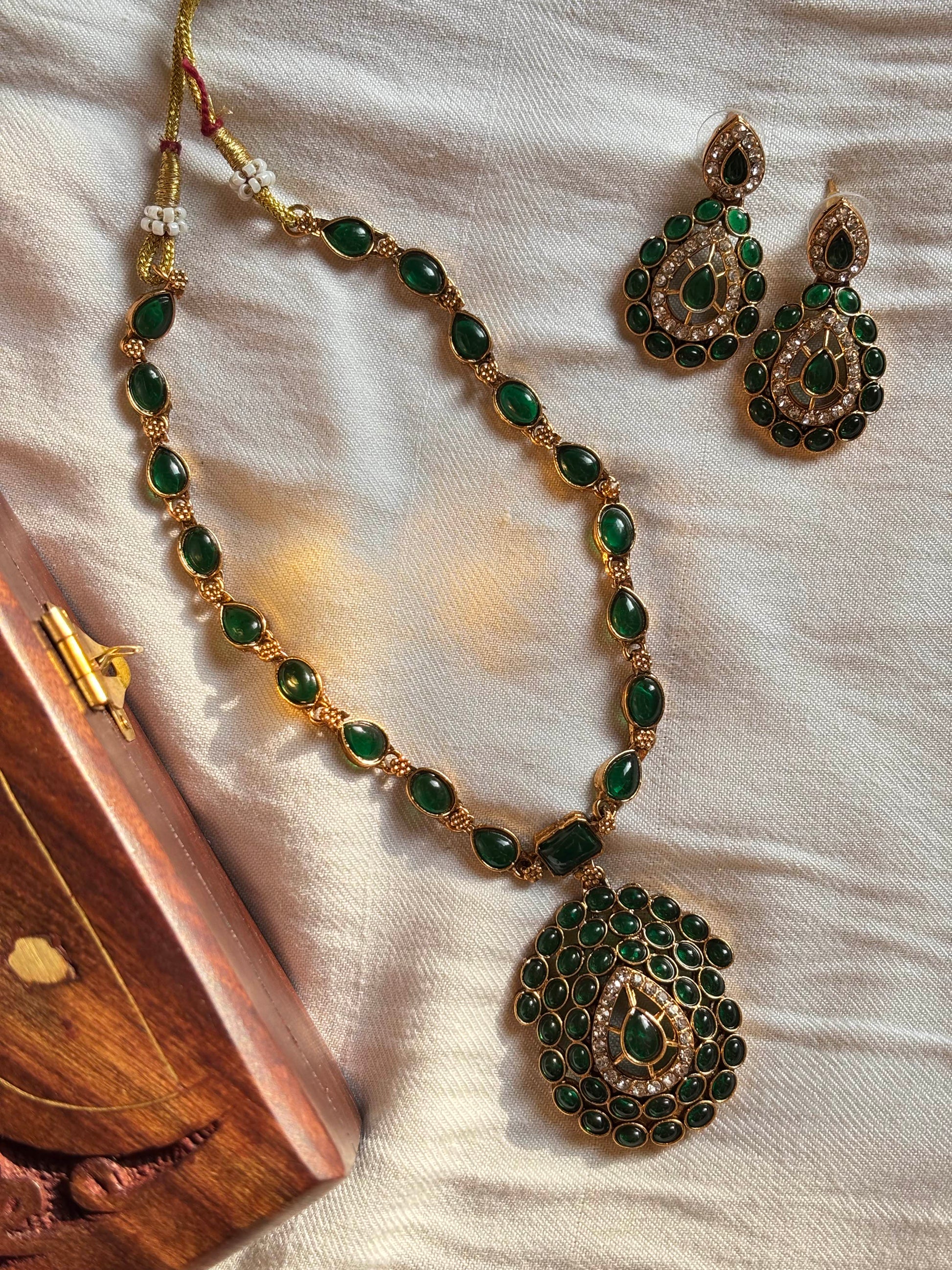 The long haaram features deep emerald green teardrop stones set in antique gold-tone detailing, connected by intricate Polki-style work that radiates royal charm. The large oval pendant adds a bold yet graceful finish to the necklace, making it the perfect centrepiece for any traditional attire.