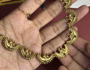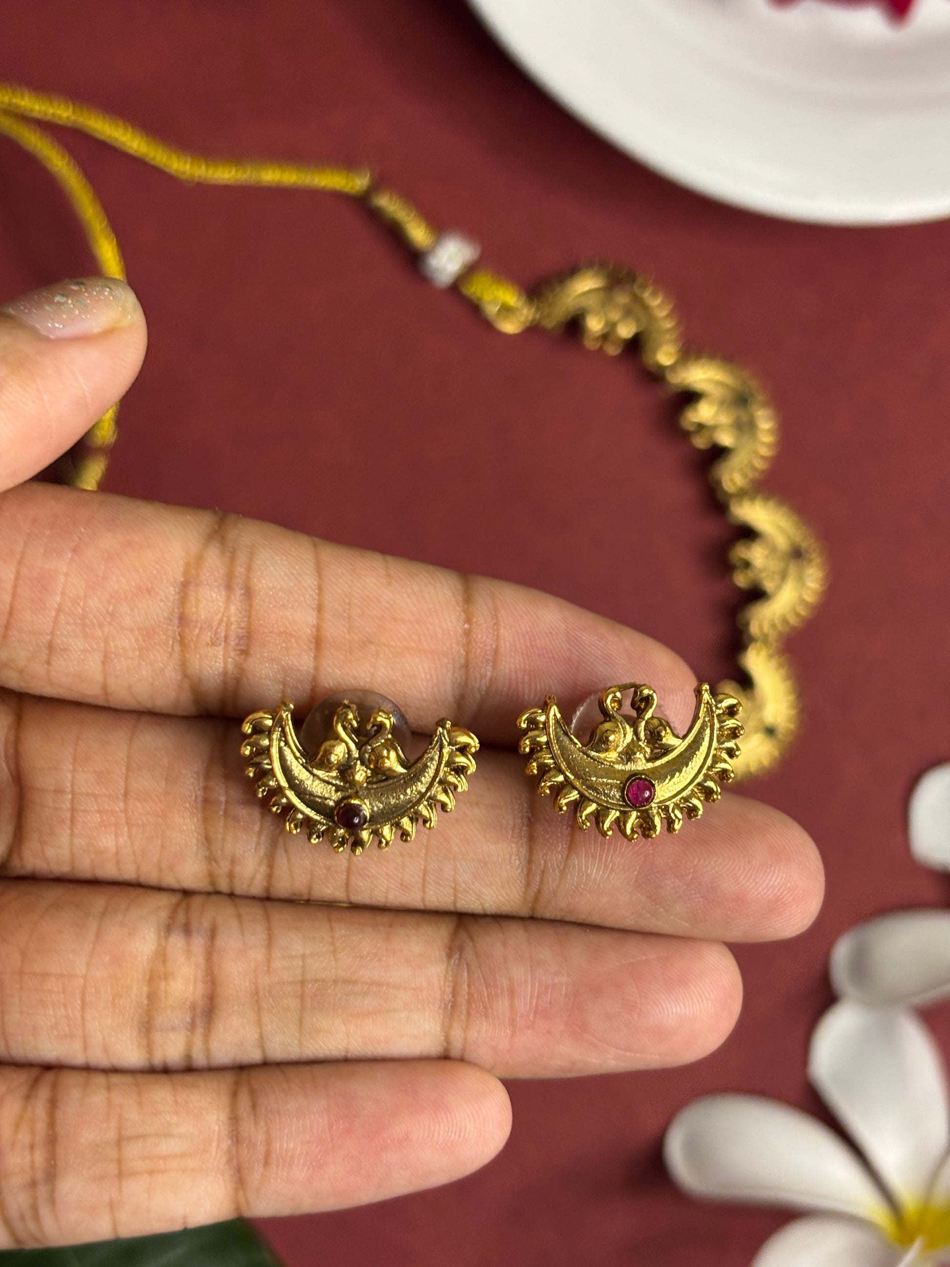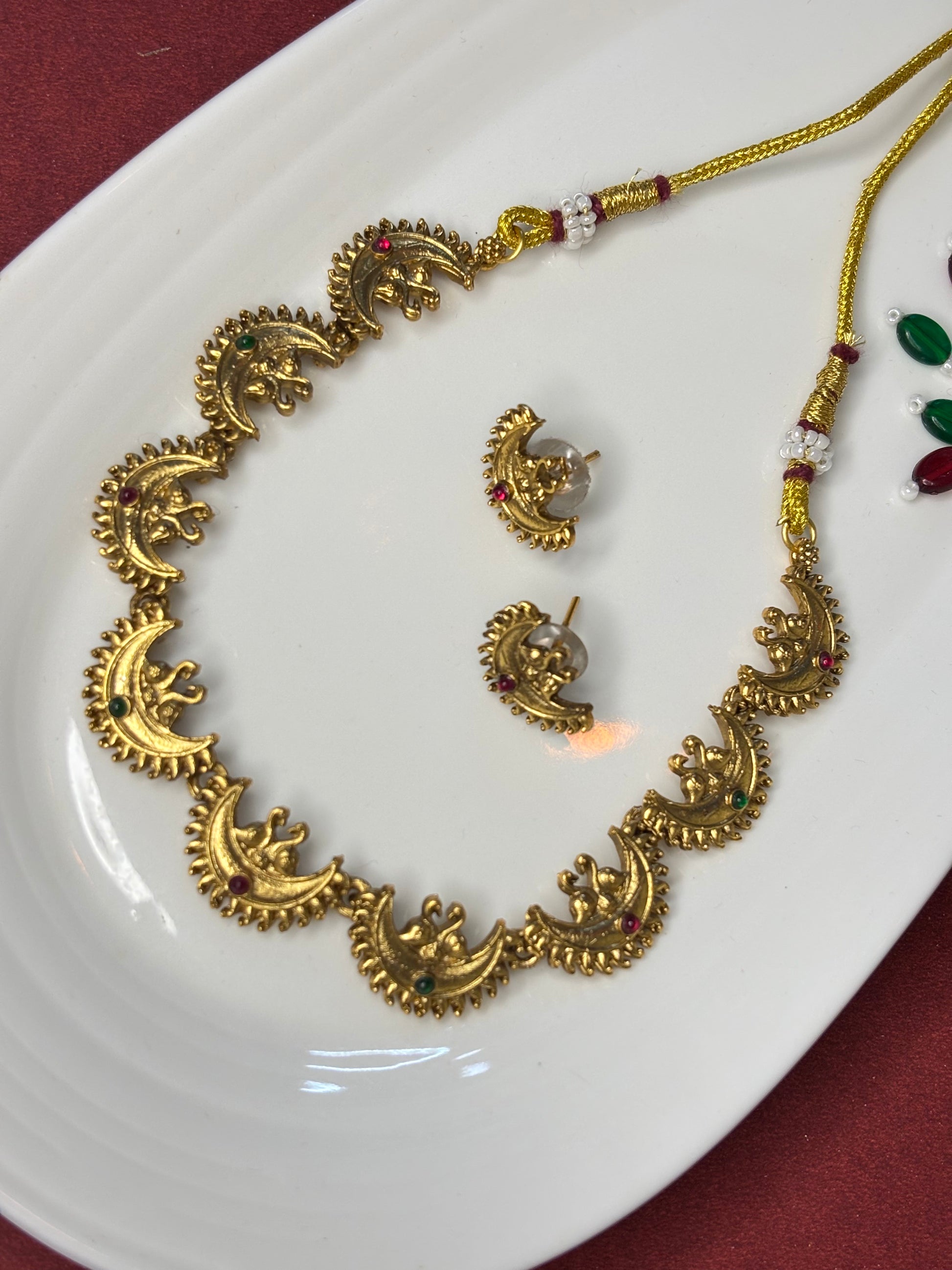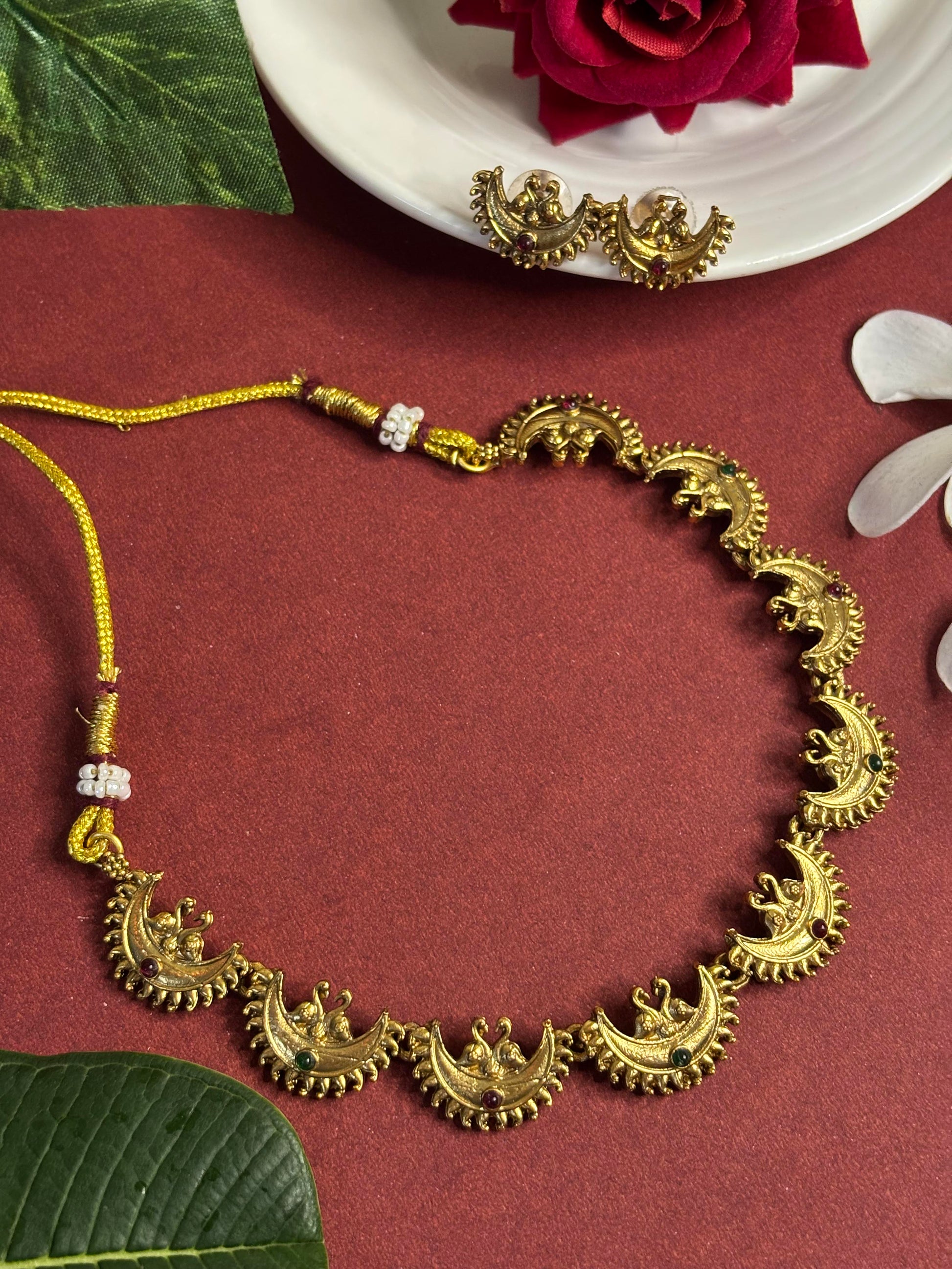 Elevate your ethnic look with our Regal Crescent Moon Choker Set, a stunning piece inspired by traditional temple jewelry designs. Featuring delicately crafted crescent moon motifs with antique gold plating, accented by tiny red and green stones, this set exudes elegance and heritage charm.